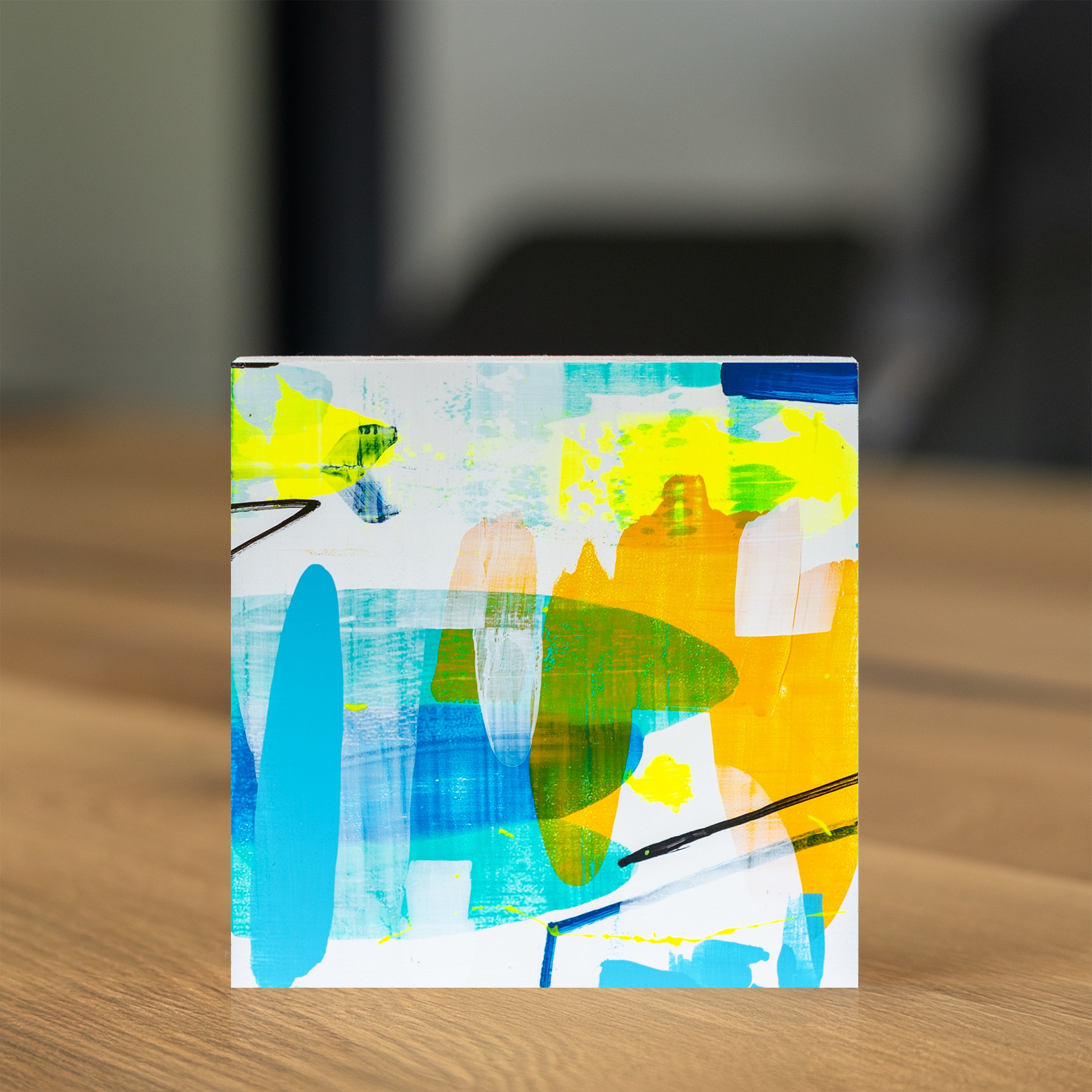 Ob als Blickfang im Wohnzimmer, inspirierender Akzent im Büro oder originelles Geschenk zum Geburtstag, Einzug oder Jubiläum – dieses Mini-Gemälde bringt moderne Kunst in kompakter Form in jeden Raum. Jedes Gemälde ist ein Unikat – es gibt keine Drucke oder Reproduktionen. Die starke Farbwirkung und die vielseitige Komposition machen dieses kleine Kunstwerk zu einem stilvollen Akzent in modernen Wohnräumen, Büros oder Ateliers.