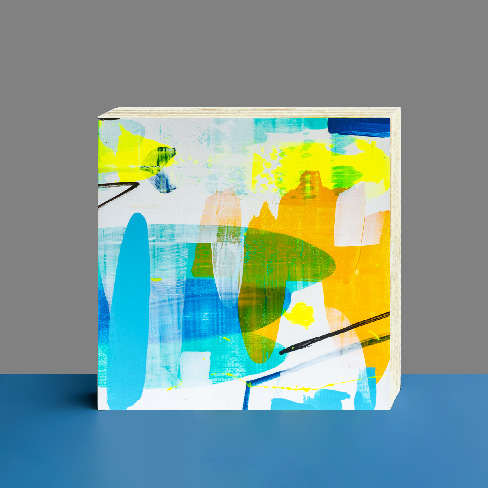 Im Mittelpunkt stehen kräftige Blau-, Gelb- und Orangetöne, ergänzt durch lebendige Türkisakzente sowie feine schwarze Linien. Großzügige Pinselstriche und transparente Schichten erzeugen Tiefe und Bewegung, während klare Flächen für Ruhe und Struktur sorgen. Das Bild vermittelt Lebensfreude, Leichtigkeit und kreative Energie – ideal für moderne Wohn- und Arbeitsräume.Das Werk eignet sich ideal als moderne Wandkunst, als stilvolle Dekoration für kleine Räume oder als individuelles Geschenk für Kunstliebhaber:innen.