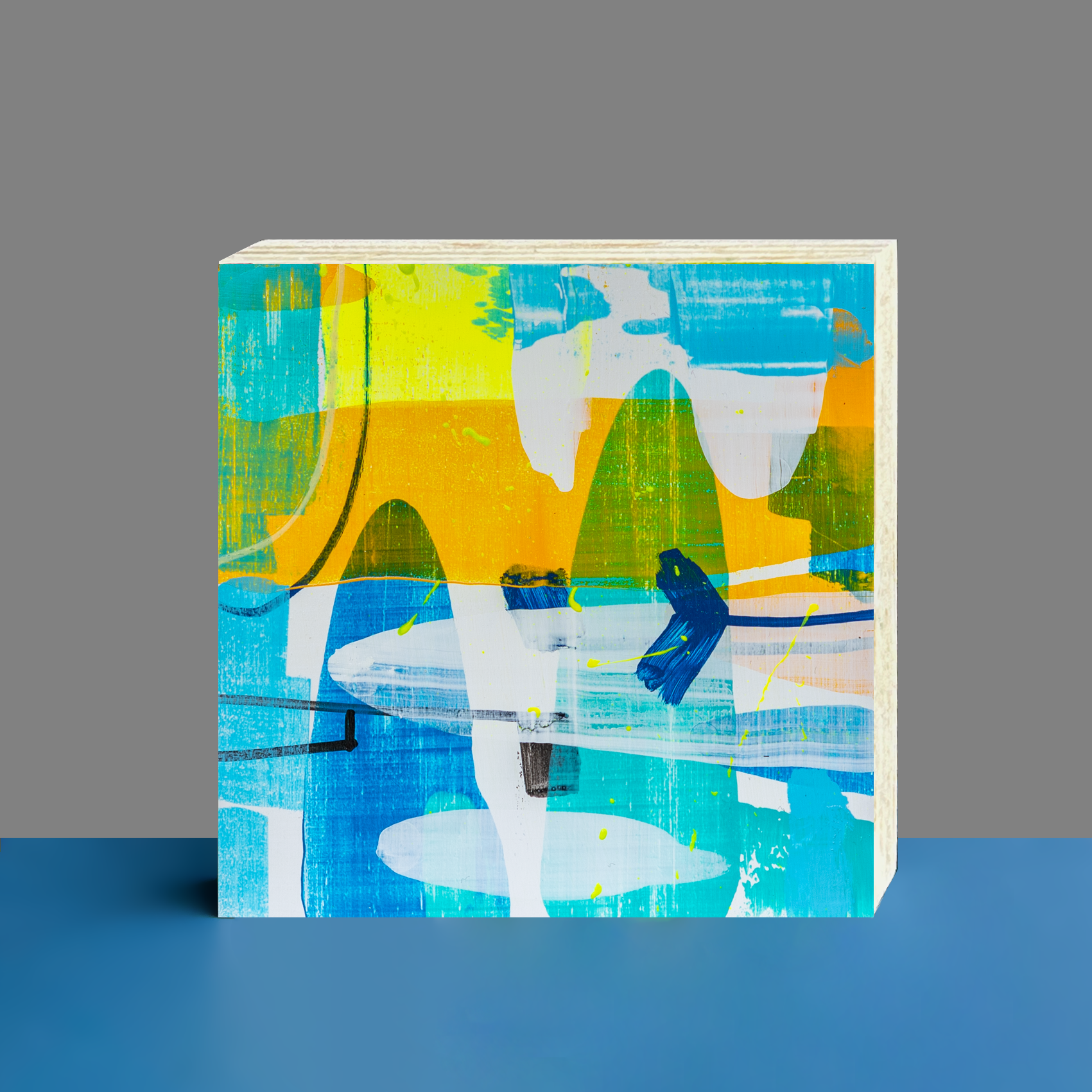 Im Mittelpunkt stehen kräftige Blau-, Gelb- und Orangetöne, ergänzt durch lebendige Türkisakzente sowie feine schwarze Linien. Großzügige Pinselstriche und transparente Schichten erzeugen Tiefe und Bewegung, während klare Flächen für Ruhe und Struktur sorgen. Das Bild vermittelt Lebensfreude, Leichtigkeit und kreative Energie – ideal für moderne Wohn- und Arbeitsräume.Das Werk eignet sich ideal als moderne Wandkunst, als stilvolle Dekoration für kleine Räume oder als individuelles Geschenk für Kunstliebhaber:innen.