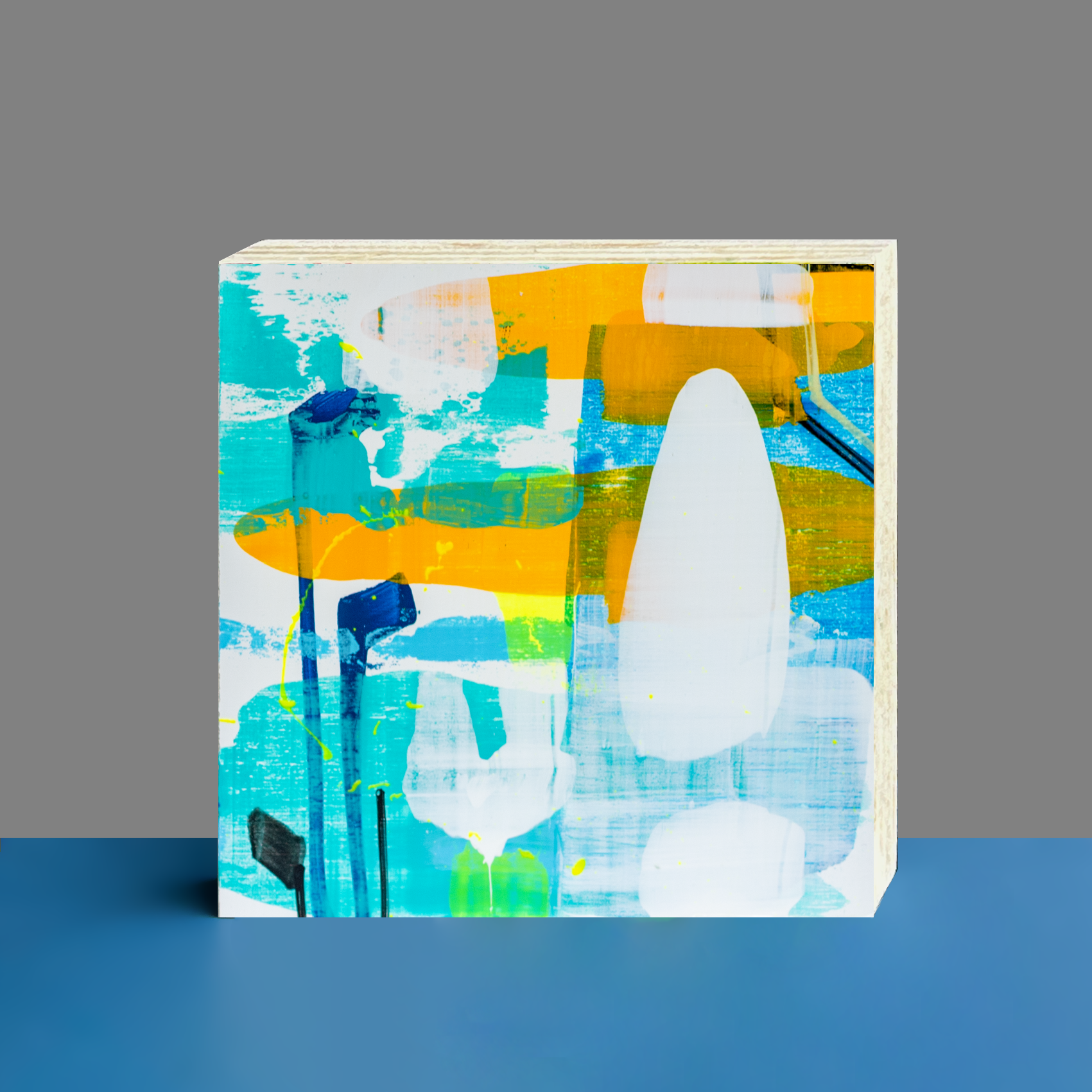 Im Mittelpunkt stehen kräftige Blau-, Gelb- und Orangetöne, ergänzt durch lebendige Türkisakzente sowie feine schwarze Linien. Großzügige Pinselstriche und transparente Schichten erzeugen Tiefe und Bewegung, während klare Flächen für Ruhe und Struktur sorgen. Das Bild vermittelt Lebensfreude, Leichtigkeit und kreative Energie – ideal für moderne Wohn- und Arbeitsräume.Das Werk eignet sich ideal als moderne Wandkunst, als stilvolle Dekoration für kleine Räume oder als individuelles Geschenk für Kunstliebhaber:innen.