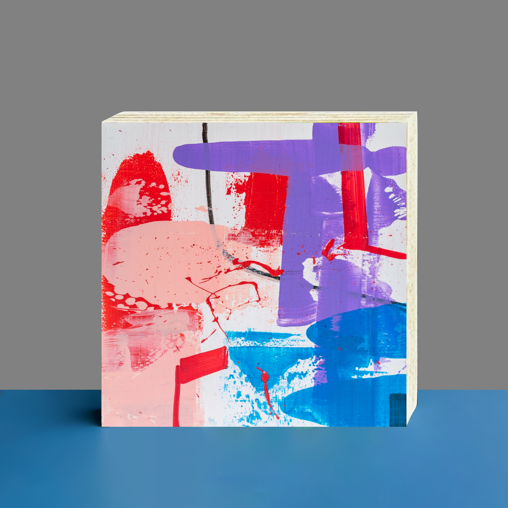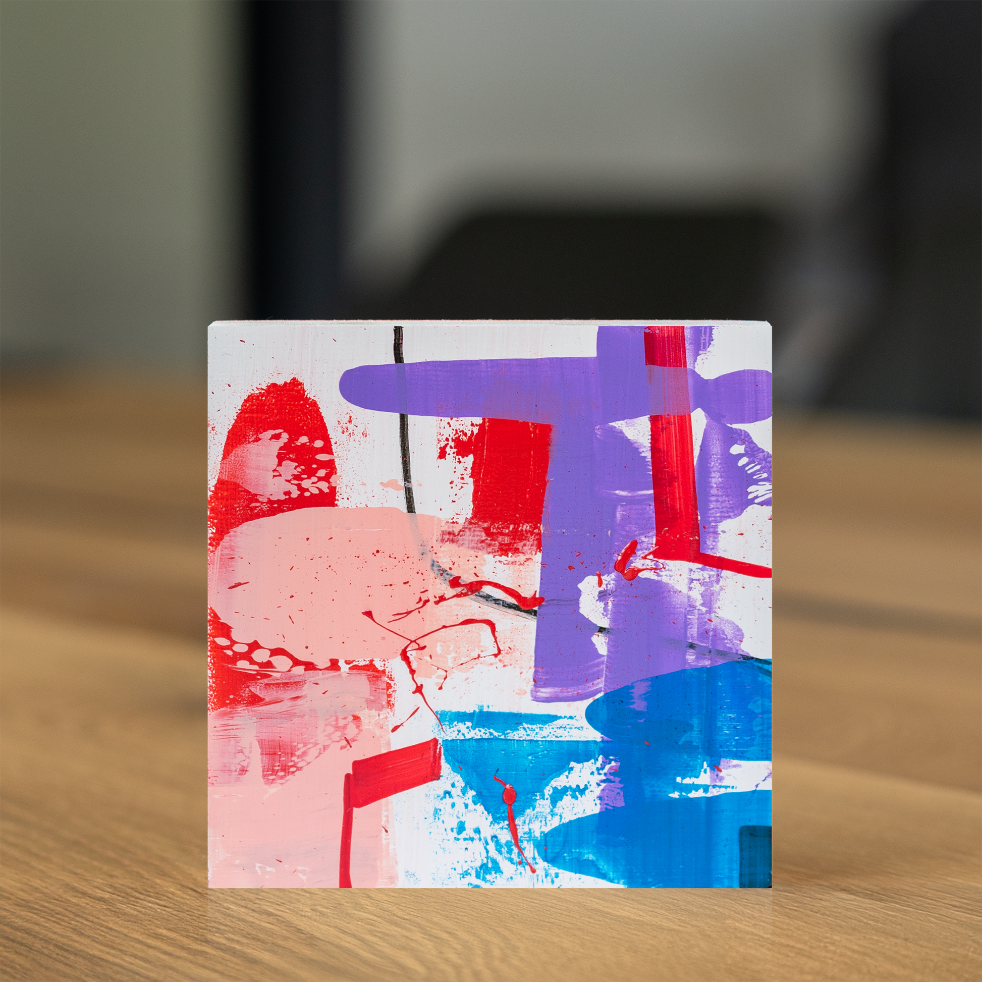 Dieses handgemalte abstrakte Acrylgemälde ist ein einzigartiges Original Kunstwerk auf einer hochwertigen Multiplexplatte mit den Maßen 12 x 12 cm. Die lebendigen Farbschichten in Blau, Rot, Lila, Rosa und Weiß schaffen eine spannende Komposition aus Dynamik und Balance. Schwarze Akzente und spontane Farbspritzer verleihen dem Werk eine expressive Tiefe und machen es zu einem modernen Blickfang. Das Werk eignet sich ideal als moderne Wandkunst, als stilvolle Dekoration für kleine Räume oder als individuelles Geschenk für Kunstliebhaber:innen.