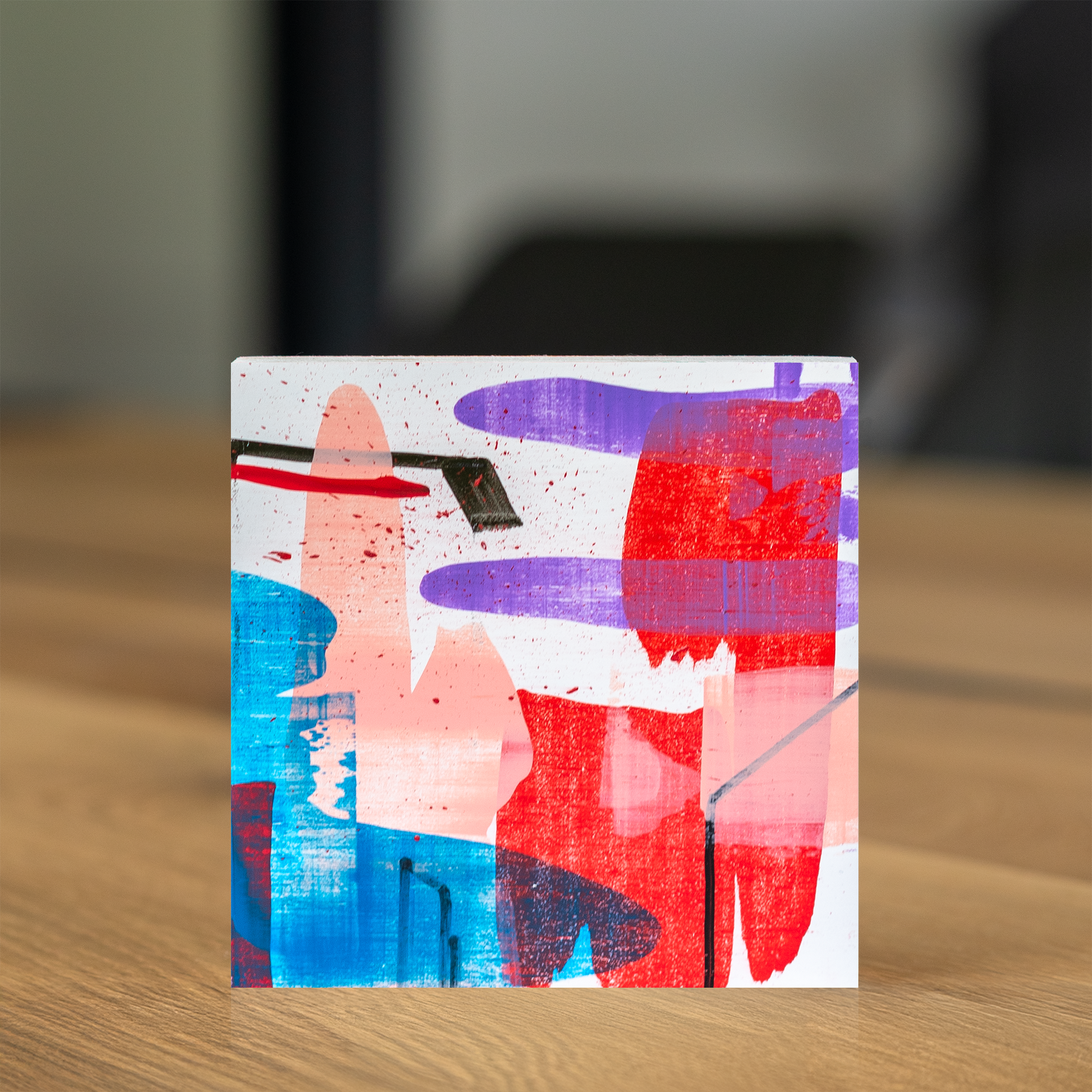 Dieses handgemalte abstrakte Acrylgemälde ist ein einzigartiges Original Kunstwerk auf einer hochwertigen Multiplexplatte mit den Maßen 12 x 12 cm. Die lebendigen Farbschichten in Blau, Rot, Lila, Rosa und Weiß schaffen eine spannende Komposition aus Dynamik und Balance. Schwarze Akzente und spontane Farbspritzer verleihen dem Werk eine expressive Tiefe und machen es zu einem modernen Blickfang. Das Werk eignet sich ideal als moderne Wandkunst, als stilvolle Dekoration für kleine Räume oder als individuelles Geschenk für Kunstliebhaber:innen.