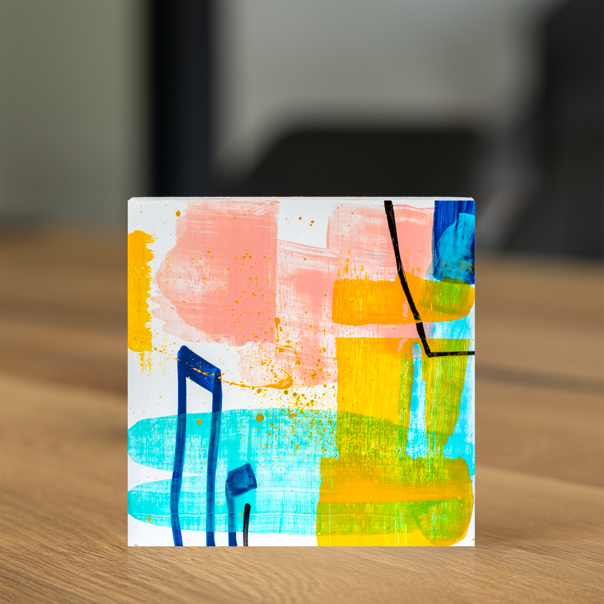 Dieses handgemalte abstrakte Acrylgemälde ist ein einzigartiges Original Kunstwerk auf einer hochwertigen Multiplexplatte mit den Maßen 12 x 12 cm. as quadratische Mini-Gemälde zeigt eine lebendige abstrakte Komposition in zartem Türkis, Koralle, Senfgelb, tiefem Blau und einigen körnigen Schwarzakzenten. Die Farbflächen und feinen Pinselstriche wirken frei und organisch – fließende Übergänge treffen auf kräftige, grafische Elemente. Der Hintergrund wirkt hell und ruhig, was die hellen Farbtupfer besonders betont. Das Werk eignet sich ideal als moderne Wandkunst, als stilvolle Dekoration für kleine Räume oder als individuelles Geschenk für Kunstliebhaber:innen.